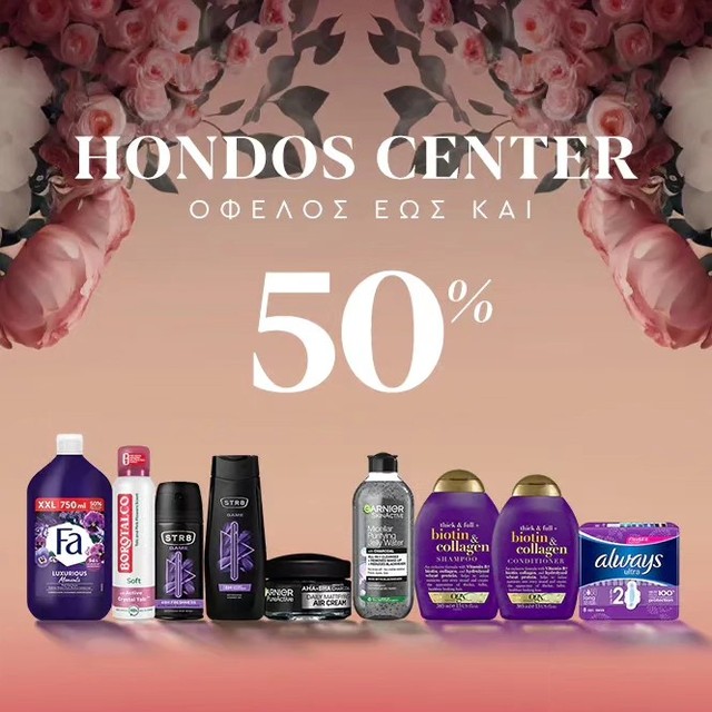 Aνακαλύψτε κάθε εβδομάδα τα αγαπημένα σας είδη καθημερινής περιποίησης στα Hondos Center με όφελος έως και 50% σε GARNIER, STR8, FA, BOROTALCO, ALWAYS, OGX.