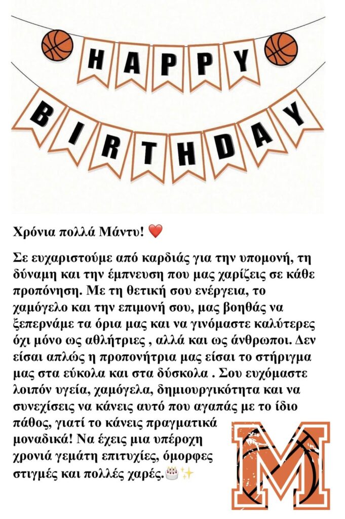 Με τήν αφορμή τών γενεθλίων τά κορίτσια τής ομάδας θέλησαν να τής εκφράσουν (μέ διαφορετικό τρόπο) το πόσο ξεχωριστή καί σημαντική είναι γιά αυτές ,καί ετοίμασαν με πολλή αγάπη ένα μοναδικό βίντεο και ένα μικρό κείμενο γεμάτο ευχές και όμορφες σκέψεις αφιερωμένες αποκλειστικά σε εκείνη.